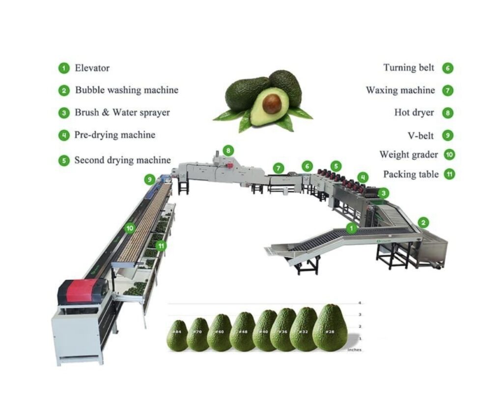 Nuestra línea de procesamiento de aguacate integra soluciones completas: desde el lavado por burbujas con elevador de rodillos y la limpieza profunda con cepilladora de alta presión, hasta el secado por aire, la clasificación electrónica por peso y el control centralizado de todo el proceso