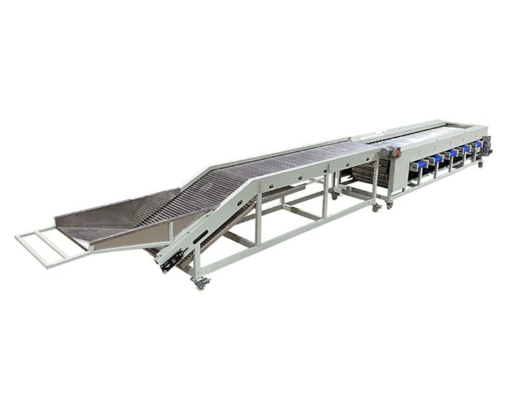 La línea de procesamiento de ciruelas se compone de 4 partes: elevador, mesa de inspección de rodillos, correa trapezoidal y clasificador de peso.