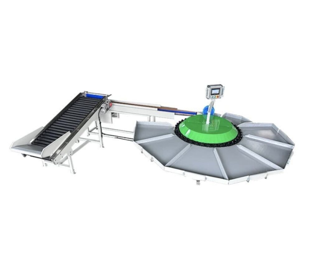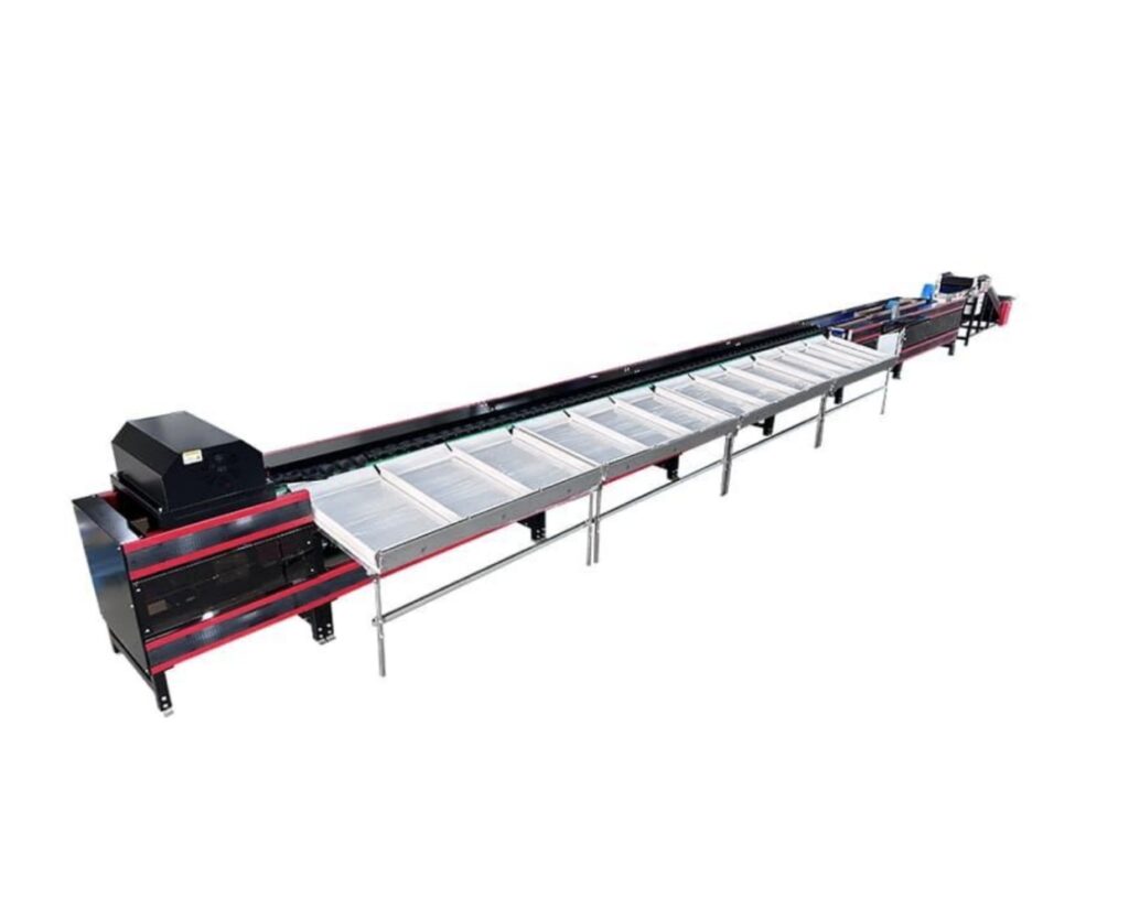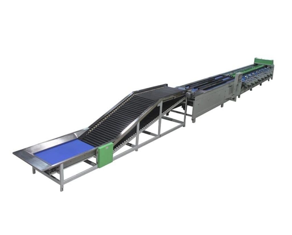 Esta línea de procesamiento de frutas Fstsort consta de 8 partes: elevador de rodillos, cepillos de pulido, mesa de preclasificación, correas trapezoidales, máquina clasificadora por peso, sistema de cámara, estaciones de empaque y gabinete de control electrónico.